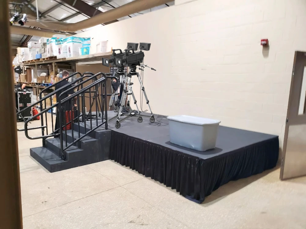 Camera riser rental with black skirt, stairs, and cameras set up for a production environment.